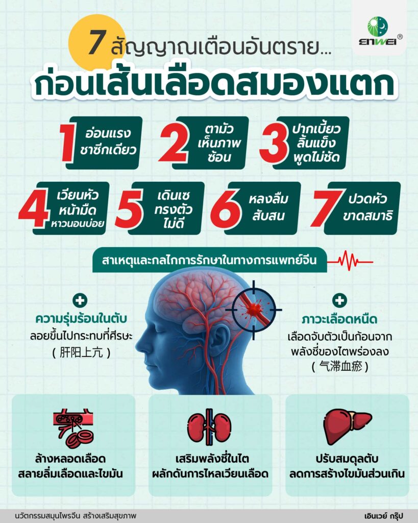 อย่ามองข้ามสัญญาณเตือนของโรคหลอดเลือดสมอง เพราะการดูแลอย่างรวดเร็วจะช่วยลดความเสี่ยงเป็นอัมพฤกษ์ อัมพาตและภาวะแทรกซ้อนรุนแรงได้มาก การดูแลหลอดเลือดให้โล่ง เลือดไหลเวียนได้ดีคือจุดเริ่มต้นสำคัญที่ทุกคนทำได้ตั้งแต่วันนี้ นวัตกรรมสมุนไพรจีนช่วยคุณได้  แพทย์จีนและเภสัชกรเอินเวย์พร้อมให้คำปรึกษา โทร 02-751-4399 (20 คู่สาย) หรือไอดีไลน์ @enwei